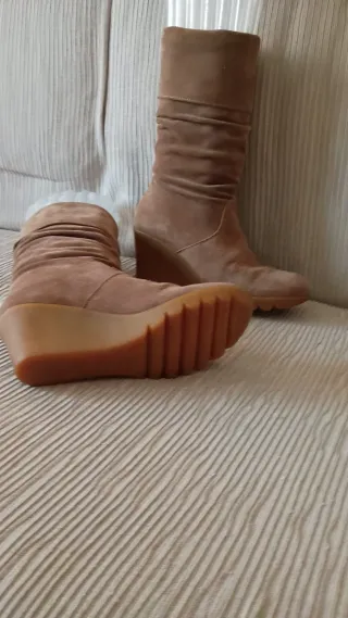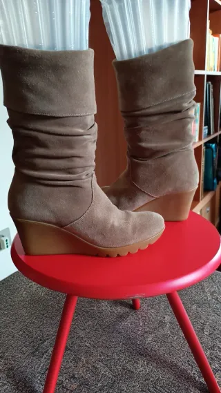 Stivali alti in pelle scamosciata, con tacco a zeppa. Perfetti per completare un look casual. N.40 ma vestono un po' più piccolo (39/39.5) - Materiale: Pelle scamosciata - Colore: Marrone/Beige - Modello: Stivali alti - Dettagli: Tacco a zeppa, design arricciato