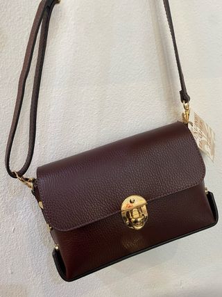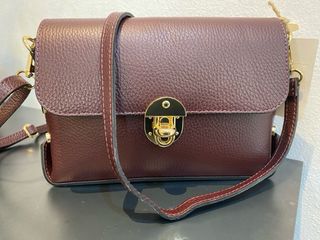 Borsa a tracolla in vera pelle, prodotta in Italia. Un accessorio elegante e versatile. - Materiale: Vera pelle - Dettagli metallici color oro - Chiusura a girello _ Colore Bordeaux _ Misure L 24cm. A 16 cm profondità 7 cm.