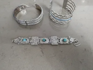 braccialetti in stile etnico. - Bracciale rigido con catenella sicurezza per chiusura - Bracciale rigido a onde con dettagli azzurri. - Bracciale a maglie con pietre turchesi e incisioni. Euro 4,50 cadauno Euro 12 set 3 bracciali