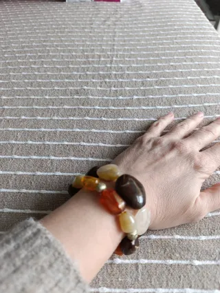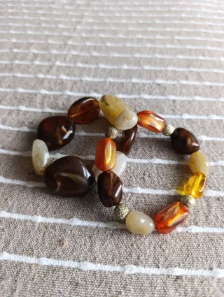 Coppia di bracciali dai toni marroni/beige e ambra che riproducono pietre ( materiale plastica). Interno elastico estensibile.Da indossare insieme o separatamente. Indossati solo un paio di volte. Come nuovi