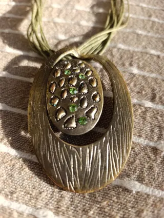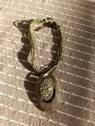 Bellissima collana multifilo in cotone verde con ciondolo colore bronzo con brillantini verdi. Bella da indossare su un décolleté scollato o con un collo alto. In perfetto stato generale, segnalo solo che ho ridotto un po' i fili verdi tagliandoli vicino ai ganci per alleggerirla un po' poiché la trovavo troppo piena (vedere ultima foto). Ma indossata non è visibile