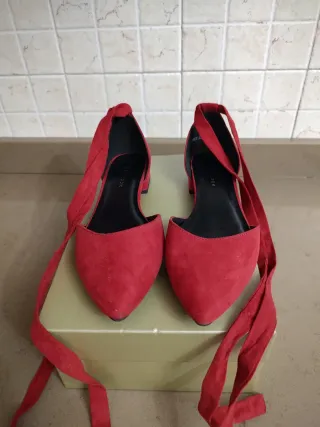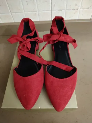 Eleganti ballerine rosse con un design a punta e lacci da annodare alla caviglia. realizzate in ecopelle scamosciata per un effetto morbido e raffinato. Tacco cm 1,5 Brand New Look Pari al nuovo