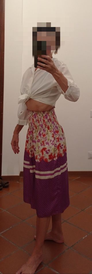 Bellissima gonna midi, perfetta per l'estate! - Realizzata in tessuto di seta, leggero e fluido. - Presenta una stampa floreale multicolor su fondo chiaro e una fascia viola in basso. - La gonna ha una vestibilità comoda e si adatta perfettamente alla figura. Elasticizzata in vita, può essere portata come abitino.