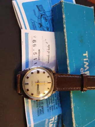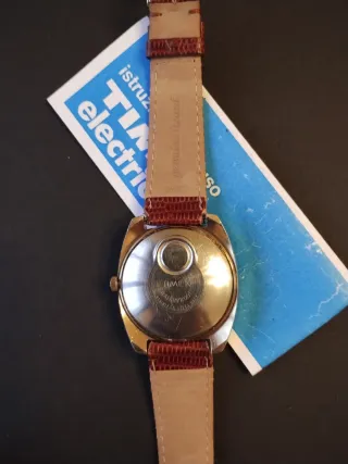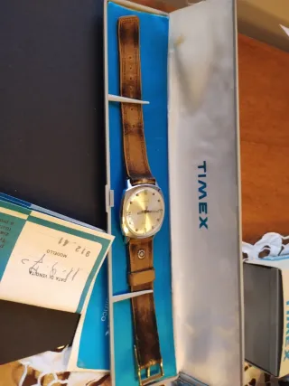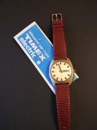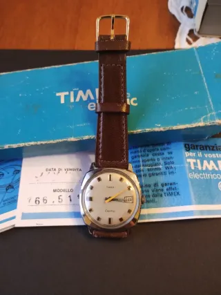 Orologio Timex Electric anno 1970 Day Date, primo modello, completo di scatola e documenti originali. Un pezzo raro per collezionisti. Batteria Nuova. Orologio in ottime condizioni estetiche, solo qualche segno dovuto al 40ennale uso. Cinturino originale dell'epoca. Istruzioni originali L'orologio funziona regolarmente senza problemi al datario, per eseere perfetto necessita solo della regolazione del tempo. - Modello: Timex Electric - Condizioni: come da foto, con segni di usura sul cinturino in pelle - Scatola e garanzia inclusi