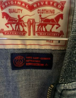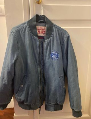 Bomber Levi's uomo, un'edizione speciale creata in collaborazione con il Paris Saint-Germain. - Patch PSG sul petto. - Tessuto denim. - Collo e polsini a costine. - usato pochissimo e acquistato nello store di parigi