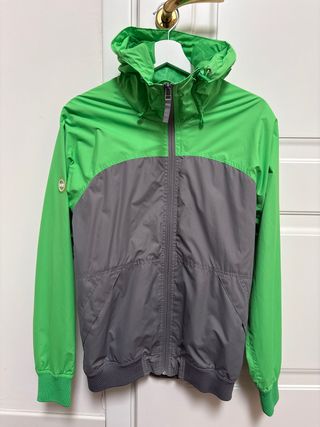 Giubbino sportivo da uomo con cappuccio. - Zip frontale. - Polsini e fondo elasticizzati. - Logo sul braccio sinistro. - interno traspirante, ideale per ogni stagione, molto versatile - ATTENZIONE bottone tasca destra cone da foto é leggermente staccato ma non comprometto uso della tasca - antivento e ideale anche per uso sportivo o giornaliero - cappuccio regolabile