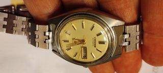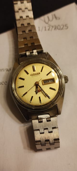 Stupendo orologio da donna Citizen Eagle Seven Automatico Day Date con bracciale originale Citizen. - Bellissimo quadrante di un giallo tenue. - Orologio proveniente da un lotto è rimasto in un cassetto per anni, ripulito e messo in funzione senza nessun altro intervento, a parte la sostituzione del vetro che era molto rovinato, mantiene una precisione ottima. - Condizioni ottime, minimi segni di utilizzo in rapporto agli anni. Foto e video prima della spedizione per attestarne il funzionamento. Vendita di beni usati tra privati, formula visto piaciuto