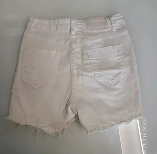 Shorts in denim bianchi con dettagli strappati e fondo sfrangiato. Tg M - Vita alta - Tasche anteriori e posteriori - Chiusura con zip e bottone
