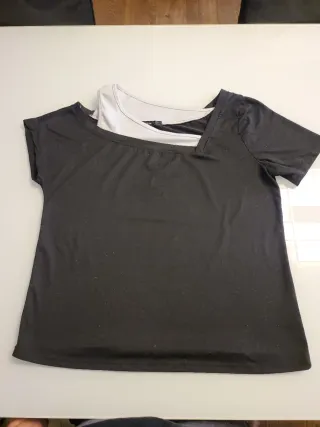 Maglia da donna con un design moderno e particolare. - Scollo asimmetrico che aggiunge un tocco di stile. - Maniche corte.