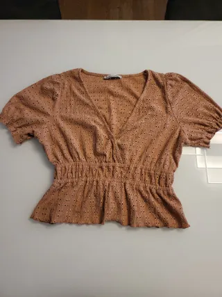 Maglia da donna con un bel design. - Scollo a V. - Maniche corte a sbuffo. - Elastico in vita. - Tessuto traforato.
