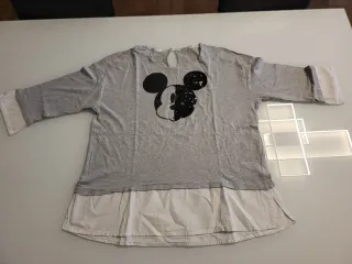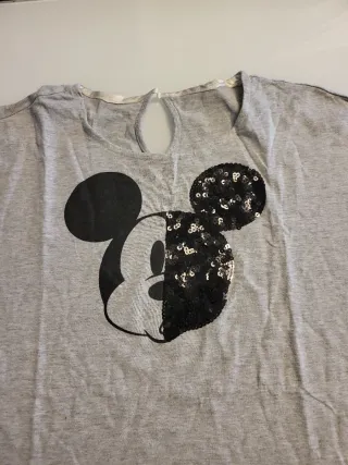 Maglia da donna con stampa di Topolino. - Maniche a 3/4. - Dettaglio con paillettes sul viso di Topolino. - Fondo bianco a contrasto.
