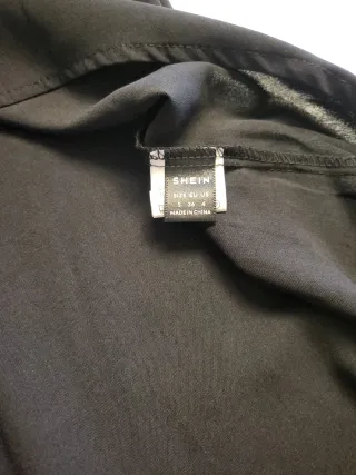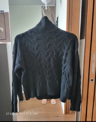Elegante maglia da donna nera, perfetta per diverse occasioni. Tg S - Dettagli in pizzo trasparente sulle spalle e sul décolleté. - Design asimmetrico con orlo più lungo sul retro. - Tessuto leggero e fluido.