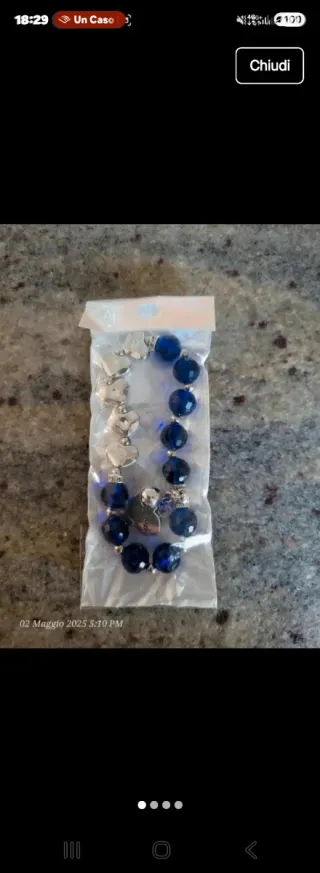 Elegante bracciale da donna con perle blu e dettagli argentati. - Perle blu sfaccettate. - Ciondoli a forma di cuore argentati.