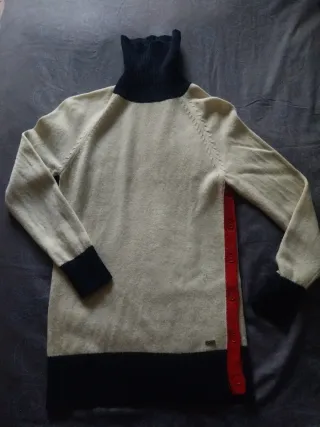 Maglione Slam con collo alto e maniche lunghe a raglan. - Dettaglio a contrasto rosso con bottoni. - Collo, polsini e fondo blu scuro. - Logo discreto sul fondo. - Misto lana-viscosa-cashmere. - Circonferenza seno cm 90. - Lunghezza cm 73. - Indossato poche volte. - Nessun buco o segni di usura