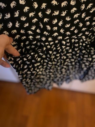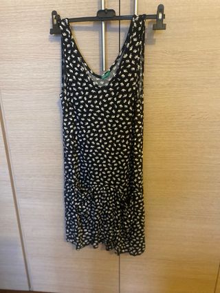 Vestito estivo Benetton con una simpatica fantasia di elefanti. - Fantasia all-over di elefanti bianchi su fondo nero. - Modello senza maniche con scollo a V. - Orlo leggermente svasato ha le tasche