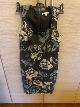 Elegante abito corto con stampa floreale. - Scollo quadrato - Senza maniche - Lunghezza al ginocchio È grigio scuro con i fiori beige e verde chiaro