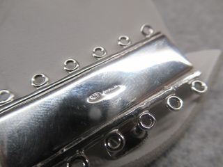 Lotto di 2 fermezze per collane identiche, in argento 925 con apertura a linguetta estraibile. Ognuna ha anellini per collane a 6 fili. Sono larghe 38 millimetri, e pesano 6,7 grammi l'una (peso totale dell'inserzione, quindi, 13,4 grammi). Il marchio dell'argento 925 è impresso sul retro. Entrambe in ottime condizioni, mai usate. Il prezzo comprende tutti e due gli oggetti che vedete nelle foto. Perfette se avete come hobby creare con fai-da-te la vostra collana multifilo o bracciale torchon!