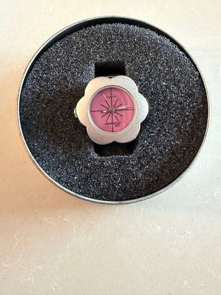 Anello con un design a forma di fiore, con quadrante rosa. - Dettaglio a forma di fiore - Quadrante di colore rosa Stato della batteria e funzionamento da verificare essendo un oggetto datato Cinturino elastico