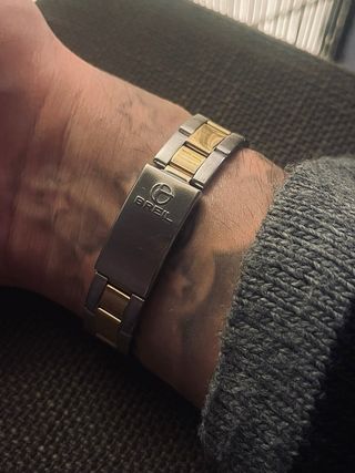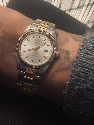 Elegante orologio Breil con cassa e bracciale in acciaio e inserti color oro. - Quadrante bianco con indici. - Datario posizionato alle ore 3. - Ghiera zigrinata colore - bracciale oyster -diametro 28mm -movimento al quarzo -piccolo segno tra ore 11 e 12