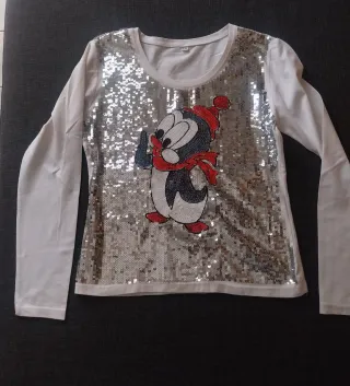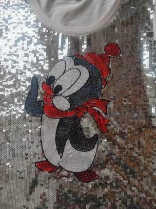 Maglia bianca a maniche lunghe con applicazione in paillettes: - Parte frontale interamente ricoperta di paillettes argentate. - Maniche e retro in tessuto bianco. - Disegno di un pinguino con cappello e sciarpa rossi. - Lunghezza cm 50 - Spalle cm 37 - Circonferenza seno cm 84 - Cotone elasticizzato