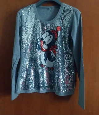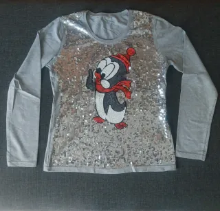 Maglia grigia a maniche lunghe con applicazioni di paillettes argentate e di un pinguino con cappello e sciarpa rossi. - Lunghezza cm 56 - Spalle cm 36 - Circonferenza seno cm 45 - Cotone elasticizzato