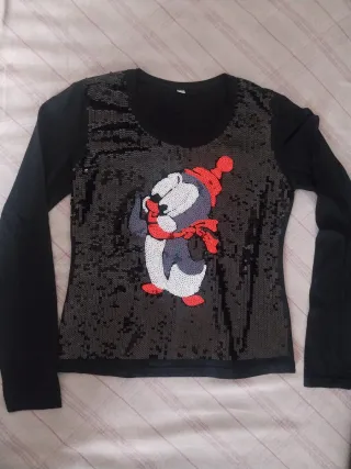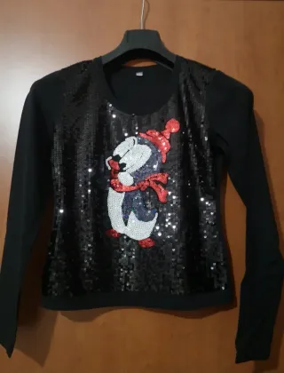 Maglia nera a maniche lunghe con decorazione in paillettes di pinguino rosso e bianco. - Lunghezza cm 52 - Spalle cm 37 - Circonferenza seno cm 84 - Cotone elasticizzato