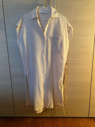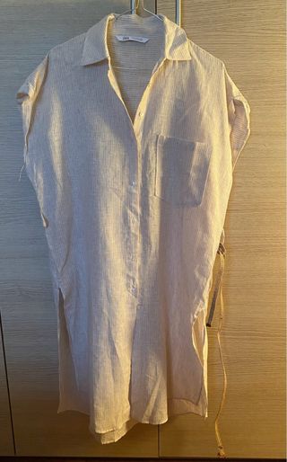 Camicia lunga Zara in tessuto leggero, perfetta per un look casual. - Maniche corte. - Taschino sul petto. - Spacchetti laterali. - Cintura in vita.