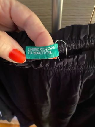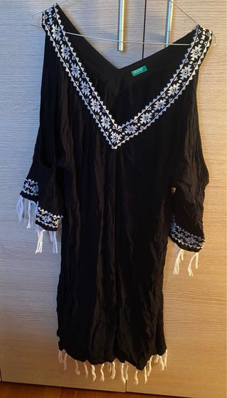 Abito estivo Benetton con dettagli ricamati e frange. - Ricami bianchi sul collo e sulle maniche. - Maniche a 3/4 con spacchi. - Orlo con frange bianche. - Tessuto leggero e arioso.