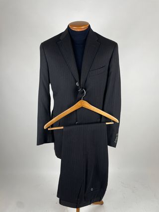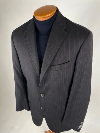 Abito Corneliani vintage anni ‘90 Made in Italy, modello sartoriale di alta qualità, in lana vergine 97% con 3% elastan. Colore antracite molto scuro (quasi nero) con sottile gessatura bordeaux, visibile in luce naturale. Linea realizzata Expressly for Santino – Best Look. Il completo è composto da giacca + pantaloni coordinati. Giacca Taglia 50 IT (Drop 8 – veste L) Spalle: 48 cm Torace (ascella/ascella): 53 cm Lunghezza totale: 89 cm Maniche dal centro : 58 cm Pantaloni: Vita: 44 cm (88 cm totali) Lunghezza da cintura in giu’: 104 cm Fondo: 20 cm Orlo liscio Ottime condizioni generali