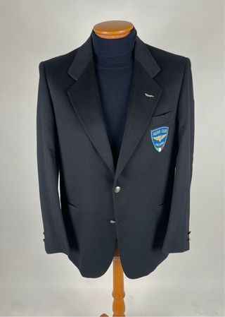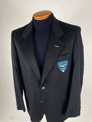 Blazer ufficiale Aero Club Milano, realizzato dal prestigioso sartificio italiano Del Mare 1911 in pregiato tessuto Piacenza Supercashmere. Capo di alta qualità sartoriale, destinato a soci o piloti del club durante eventi o cerimonie. Tessuto: Piacenza Supercashmere (lana/cashmere di altissimo pregio) Colore: blu scuro / navy Stemma ricamato Aero Club Milano sul petto Bottoni metallici personalizzati Spilla a forma di aereo sul revers Misure (capo steso): Spalle: 47 cm Torace ascella–ascella: 56 cm Lunghezza totale: 82 cm Manica (dal centro): 56 cm Equivalente a una taglia 48/50 IT Ottime condizioni generali. Tessuto morbido