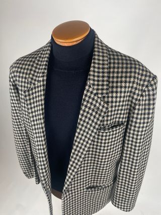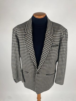 Giacca uomo vintage Daniel Dodd – Bologna, produzione Made in Italy, taglia 50 (L/XL) in elegante fantasia pied de poule bianco/panna e nero. Modello anni ’80 con spalle leggermente costruite, taglio regolare e chiusura con un solo bottone. Completamente foderata internamente (fodera raso viola). Capo di qualità italiana, ideale per look casual chic o per chi cerca blazer vintage originali. Condizioni: ottime per l’età, nessun difetto evidente. Misure (a capo disteso): Spalle: 57 cm Torace (sottoascella): 65 cm Lunghezza totale: 78 cm Manica (dal centro): 51 cm