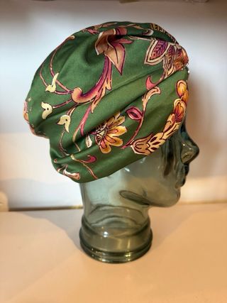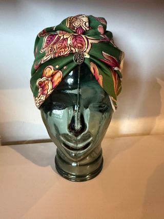 Elegante turbante chiuso e foderato, perfetto per aggiungere un tocco di stile. - Tessuto con fantasia floreale. - Dettaglio gioiello applicato frontalmente.