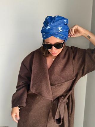 Turbante fatto a mano con tessuto originale. - Fantasia con logo Chanel. - Colore blu.