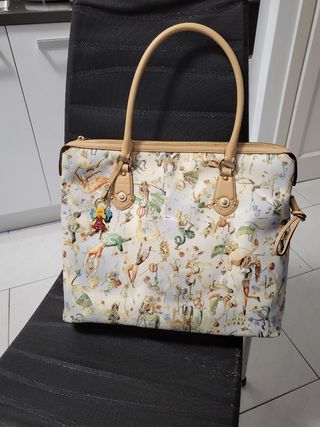 Borsa Donna Piero Guidi Magic Circus Cherie Tosca A Mano , sfumato Azzurro in materiale Goffrato con stampa Magic Circus finiture in metallo dorato,riporti in cuoio,pendente con logo. Fodera interna in tessuto stampato e tasca laterale con zip, nuova Mai Usata , Senza Cartellino. - Manici in cuoio. - Chiusura con zip. - Charm decorativo attaccato.