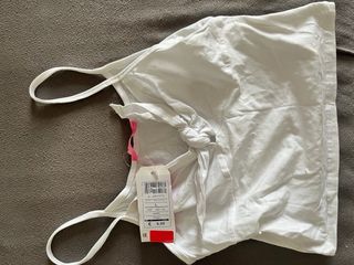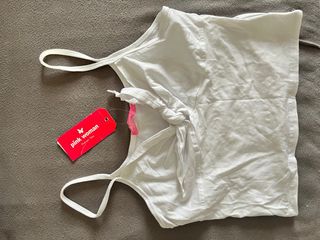 top bianco con cartellino. ce scritto taglia L ma veste taglia S