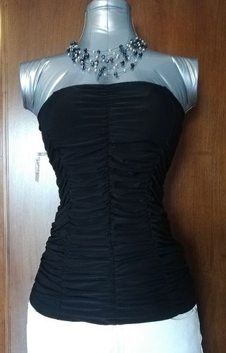Elegante top nero senza spalline. Il tessuto è sintetico, molto elastico. Contiene inserti sottili all'altezza del seno per poterlo indossare senza reggiseno. Taglia italiana 42 circa. L'etichetta interna con le indicazioni di lavaggio è stata rimossa, ma il top non è mai stato indossato. ❗Il top è abbassa lungo per essere indossato da persone alte, ma non abbastanza da essere portato come vestito (sono alta 1.50, non mi copre tutto il sedere). ❗Accessori e altri indumenti visibili nelle immagini non in vendita.