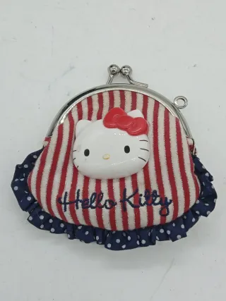 Grazioso portamonete a soffietto con design Hello Kitty. - Chiusura a scatto. - Bordino a pois blu con volant. - Decorazione Hello Kitty in rilievo.