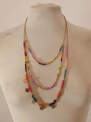 Collana alla moda composta da tre fili con perline colorate e dettagli dorati. - Design a più fili. - Perline di varie forme e colori. - Elementi metallici dorati. - Ciondoli rotondi decorativi.