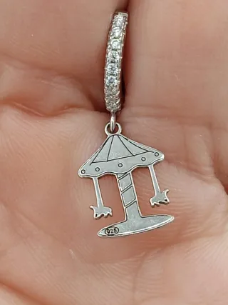 Eleganti orecchini in argento 925 con un design unico. - Cerchio impreziosito da strass luminosi diametro 1 cm. - Charm a forma di giostrina dettagliata. - Chiusura sicura e confortevole.