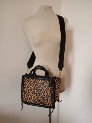 Borsa a mano con tracolla, dal vivace design leopardato. - Dettagli in pelle nera. - Lacci decorativi sui lati. - Chiusura con zip.altezza 20cm, lunghezza 26cm. Presenta lievi segni di usura sui lacci laterali come da foto.