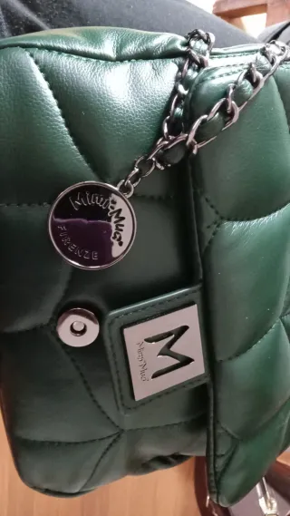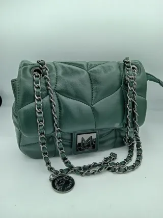 Borsa a tracolla Mimi Muà Firenze in un elegante color verde. Presenta una trapuntatura a rombi in simil pelle e una catena metallica. - Dettaglio logo metallico sul davanti. - Charm a moneta pendente con logo.