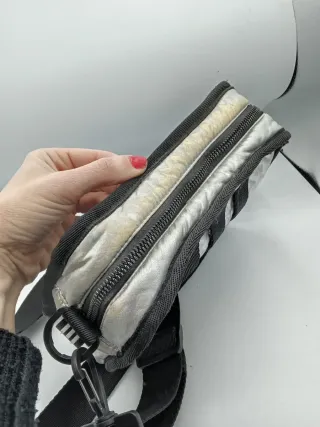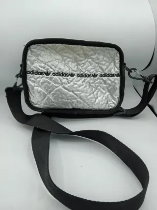 Borsa a tracolla Adidas dal colore argento con finitura stropicciata. La tracolla è nera e regolabile. - Logo Adidas ripetuto sul davanti. - Chiusura con zip. - Dettagli neri sui bordi e sulla tracolla.in alcuni punti il colore argento è sbiadito come da foto.altezza 17 cm lunghezza 23 cm