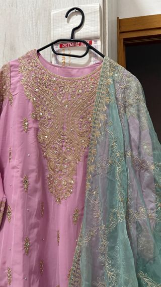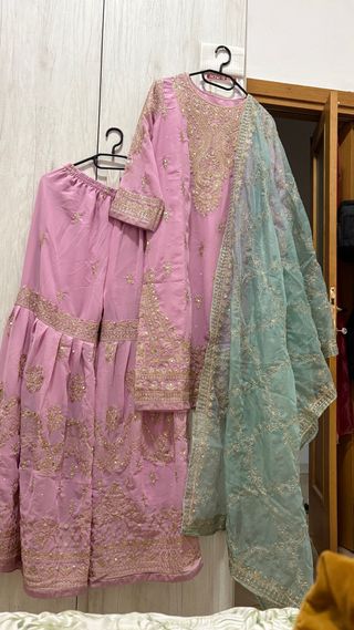Elegante abito tradizionale indiano, perfetto per occasioni speciali. - Tessuto color rosa. - Ricami dorati dettagliati sul corpetto e sulle maniche. - Pantaloni abbinati con decorazioni. - Dupatta (sciarpa) in tessuto leggero color verde acqua con bordi ricamati.
