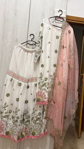 Elegante abito indiano con ricami floreali. - Tessuto bianco con dettagli rosa. - Maniche lunghe ricamate. - Dupatta abbinata in tessuto leggero.