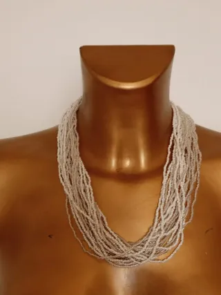 Elegante collana multifilo con perline bianche e argento. La sua lunghezza la rende versatile per ogni occasione. - Lunghezza: 55 cm - Design a più fili - Perline bianche e argento