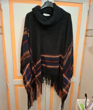 Elegante mantella con un design a quadri e frange decorative. Perfetta per aggiungere un tocco di stile al tuo guardaroba. - Collo alto a costine. - Motivo a quadri multicolore. - Orlo con frange.