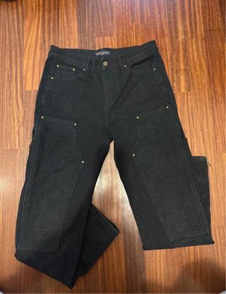 Jeans Louis Vuitton neri con un design unico. - Tessuto denim resistente. - Dettagli con motivo monogram. - Tasche frontali e posteriori. - Chiusura con zip e bottone.