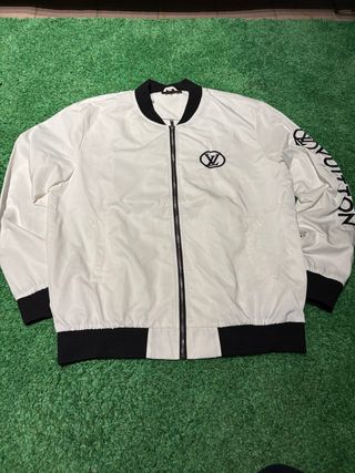 Giacca bomber Louis Vuitton in colore bianco con dettagli neri. - Logo Louis Vuitton sul petto. - Scritta Louis Vuitton sul braccio. - Polsini e colletto neri a costine.