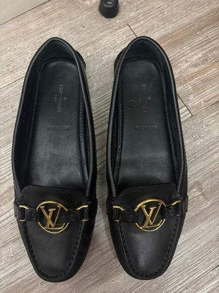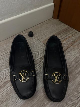 Eleganti mocassini Louis Vuitton in pelle nera con dettagli dorati. - Logo LV dorato sul davanti. - Dettagli traforati sui lati. - Realizzati in Italia.