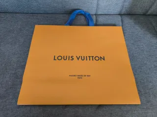 Busta regalo Louis Vuitton originale, colore arancione. - Logo LOUIS VUITTON stampato sul fronte. - Scritta MAISON FONDÉE EN 1854 PARIS sotto il logo. - Manici rossi. - Carta di alta qualità.